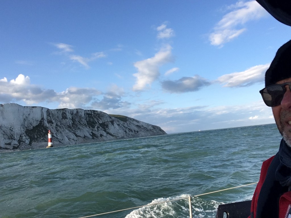 Dann stelle ich fest, dass ich völlig vergessen habe, die Fender reinzuholen. Einer ist bereits dabei, sich von seinem Knoten zu lösen … Den reinzuholen und neu zu verknoten ist bei Wellen von 2m und Wind bis BF4 auch unter Motor nicht trivial. Später haben mir die Wellen von sich aus zwei Fender an Bord geworfen (u.a. den großen Kugelfender in die Bugbadewanne) und zwei andere (die ich rausgeholt hatte) wieder vom Seitendeck gespült. Als ich um die zweite Kalkwand von West Beachy Head herum bin, hole ich das Navi-ipad hoch: zum Ziel sind es noch immer über drei Meilen. Also Vollgas.
