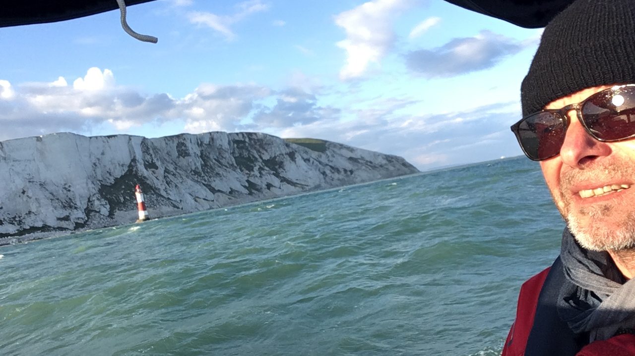 Unter Motor Richtung Stadt und Beachy Head. 18:30 Eastborne Pier passiert, 19:30 unterer Leuchtturm Beachy head passiert usw. usf. Guckst du Video: https://youtu.be/U9kCzNNngAw
