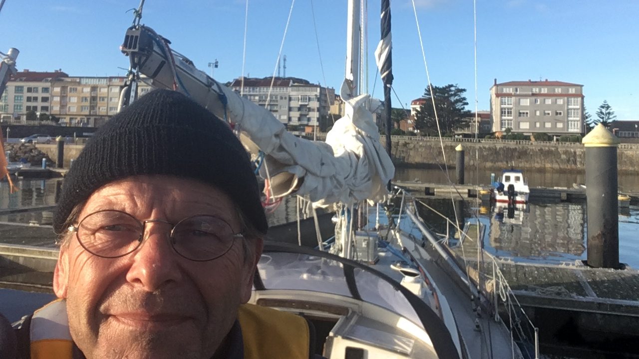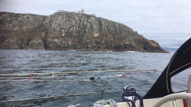 Ich fahre innerhalb vorbei (an dem Tag herrschte höhere Brandung, der Fels an der Insel warf meterhoch Gischt in die Luft), ein paar Minuten Kabbelwasser, das war’s. Die anderen beiden fahren außenrum. Bin ich zu leichtsinnig? Um halb fünf in Finisterre eingelaufen, ein junges dänisches Paar, deren Yacht dort schon liegt, über nimmt meine Leinen [hilft beim Anlegen].