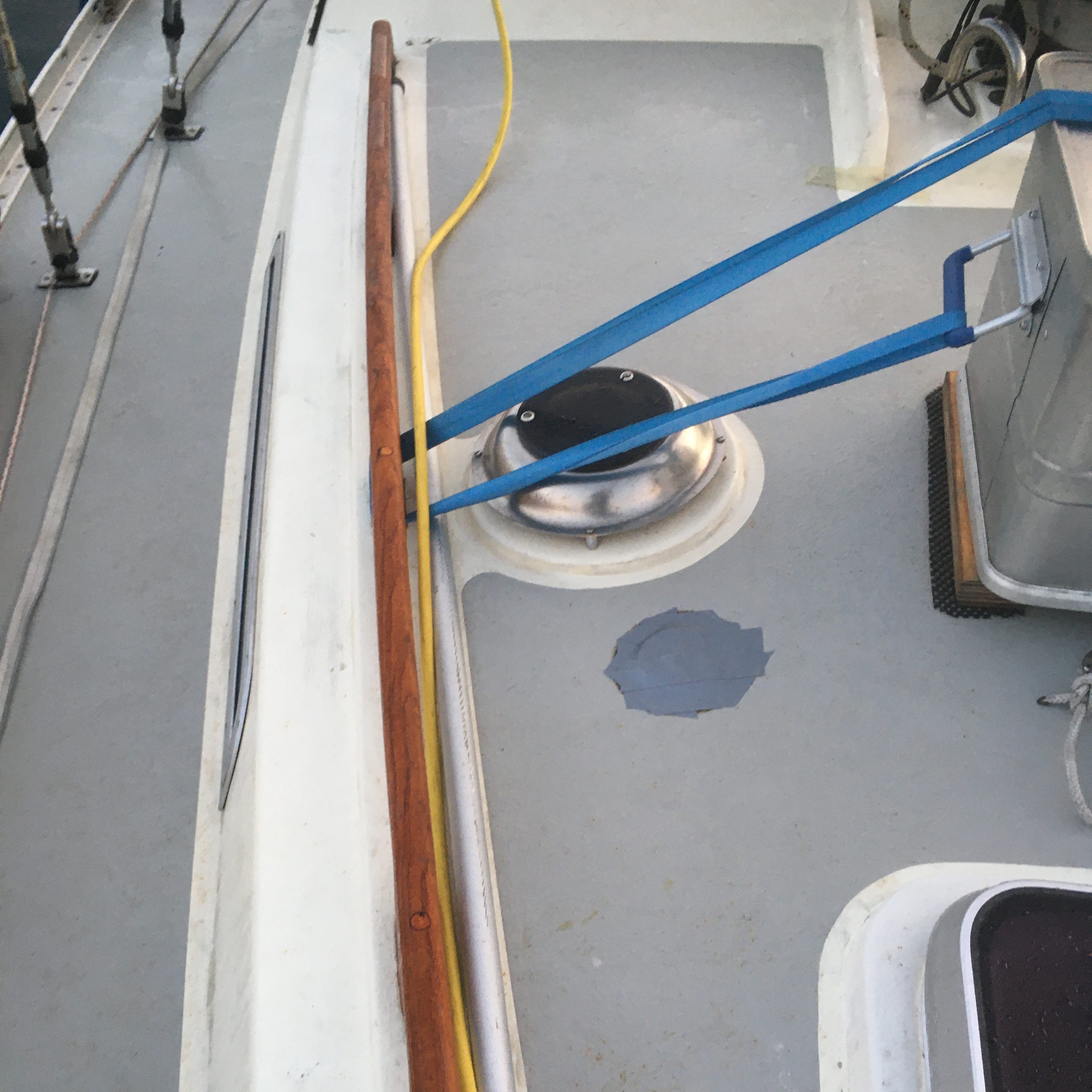 Viereinhalb Eimer Wasser (ca. 30 Liter) aus beiden Bilgen geschöpft (mit dem Schwamm getupft), danach Salon mit Frischwasser gefeudelt – Salzwasser klebt und trocknet sehr schlecht. Nur: Wo kam das ganze Wasser her? Im Schiffsinneren und auf der Einrichtung sind keine feuchten Stellen zu finden. Die Deckskante, die Verbindung zwischen Deck und Rumpf? Immerhin jagte die gute Elli mit so viel Lage [schief] durchs Meer, dass die seitlichen Laufdecks überspült worden sind. (Zum Glück hab ich Verenas Ratschlag befolgt und sämtliche Fender und Festmacher vorher verstaut! (Danke, Hartwig und Verena!)). Am Mast haben sich Leinen um den Radarreflektor verheddert. Als ich das behebe, fällt mir auch der Grund für das Salzwasser im Schiff ins Auge: Auf dem Vorschiff habe ich in der wilden Nacht einen Lüfter abgefetzt, wahrscheinlich mit der Fockschot [wird bei jeder Wende über das Vorschiff gezogen/gezerrt]. Im Deck klafft ein Loch mit fünf Zentimeter Durchmesser!