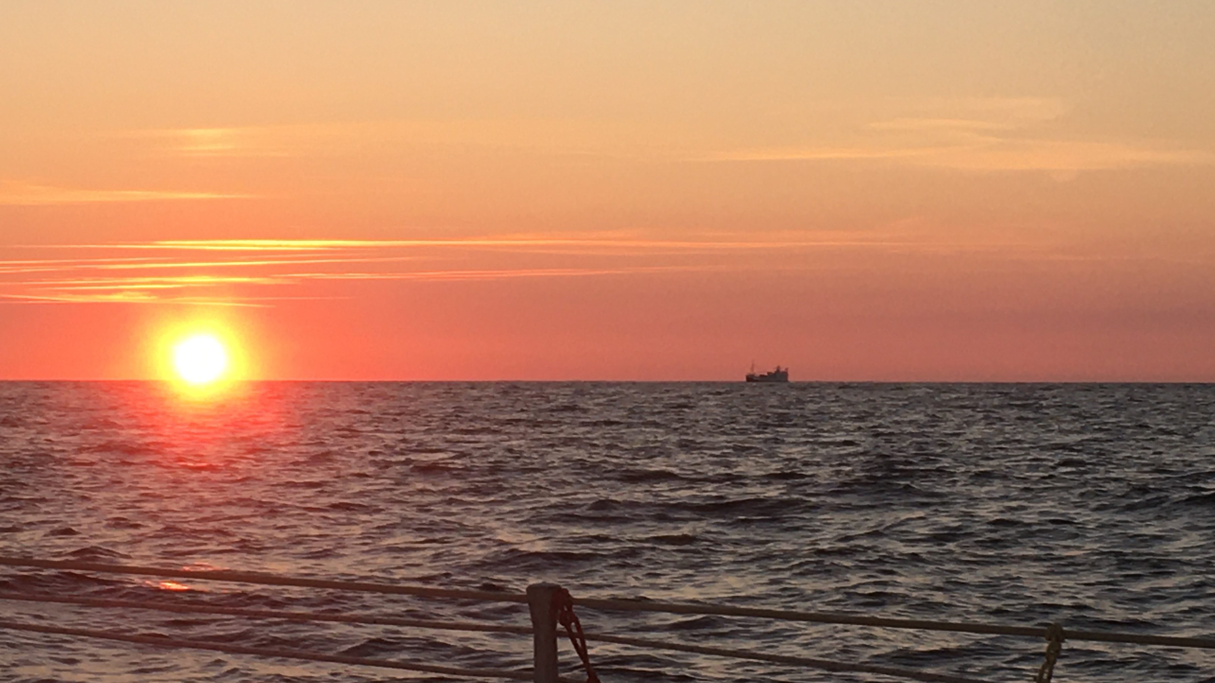 Um halb acht fängt endlich das Morgengrauen an, dann soll laut Funkwettervorhersage der Wind auf N drehen. Und tatsächlich: 08:30 weist das Logbuch Kurs 270° (straks W) und 5 kn Geschwindigkeit aus: »Läuft!« hat der Skipper geschrieben. Dabei ziehen lange hohe Wellenberge vom Atlantik herein, 3-4 m sagt der Wetterbericht. Und: »Meereszustand: ruhig.« Dabei schaukeln selbst die treibenden (oder ankernden?) Frachter wild hin und her. Guckst du Video: Frachterschaukeln