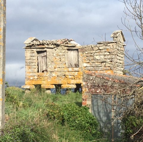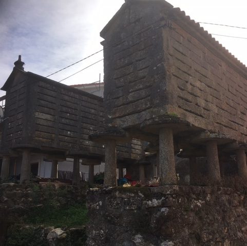 Auf dem Rückweg, über den Hügel hinter dem Kap, bin ich fast alleine. Im alten Dorf oben am Hügel stehen noch mehr der in Galizien üblichen Getreidespeicher. (Die Säulenfüße und Kragsteine sollen die Mäuse abhalten). Anderthalb Stunden Lesen am Stadtstrand, dann zum Argentinier. Das größte (und beste) Rinderkotelett meines Lebens (Verzeihung Celia, Lioba: musste mal sein). Jetzt noch diesen Blog abschicken und Feierabend. Morgen soll es Nordwind geben. Gut, um nach Süden zu kommen …