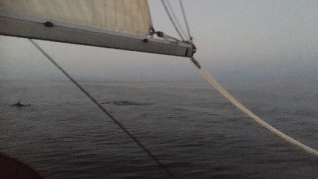 T-Shirt-Wetter, genial. Um halb sechs, der Wind ist schwach, den Gennaker [größtes, geblähtes Vorsegel] gesetzt, das Meer ist glatt, bis auf winzige Wellen („ripples“), wir machen vier Knoten, die Segel schlafen, ein Traum. Und diesmal auch mit Delfinen. Weil der Wind schwach bleibt und nichts auf eine Wetteränderung hindeutet, riskiere ich es und lasse den Gennaker über Nacht oben (das Segel ist nicht ganz einfach zu bergen [einzuholen]). Außerdem kreuze ich vor dem (Nicht-) Wind [wenn der Wind genau von hinten kommt, schaukelt das Schiff, die Segel flappen. Einige Grade seitlich fährt man zwar einen Umweg, hat aber angenehmere Bewegungen (und ist auch nicht viel langsamer)] Um halb eins in der Nacht zeigt das Navi, dass ich die Grenze zu Portugal überfahren hab, prima. Um zwei Uhr fahre ich meine erste Gennaker-Halse. Klappt fast ohne Probleme. Um halb vier fährt ein grell beleuchtetes Fischerboot genau auf mich zu, dreht auch nicht ab. Sie leuchten mich an, ich richte meine Taschenlampe auf die Segel – hilft alles nichts, sie halten stur auf mich zu. Als sie bis auf 20 Meter (!!!) herankommen, – ich sehe die Fischer so nahe wie an der Bushaltestelle über die Straße, winke, bekomme aber außer Starren keine Reaktion – erkenne ich den Grund: sie ziehen ein ewig langes Tau hoch, nehmen es aufs Boot (untersuchen es, pulen wahrscheinlich evtl. gefangene Fische ab) und werfen es wieder ins Meer. Ab und an kommt auch ein betongefüllter Autoreifen (Ballast) ans Licht (nicht ans Tageslicht, es ist mitten in der Nacht).