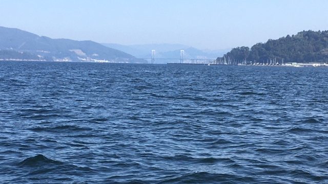 Freitag früh kommen vier Franzosen an, quetschen sich mit Mühe an den winzigen Platz am Steg hinter uns, kommen aus dem Süden und haben einen Tag motoren hinter sich (erzählen uns aber auch von Aveiro). Zehn Uhr abgelegt, unter Motor einen Abstecher in die Einfahrt nach Porto gemacht (Foto für Doro: Porto war unser Sehnsuchtsort nach der geplanten gemeinsamen Biskaya-Überquerung …), die berühmte Brücke ist im Dunst nur blass auszumachen, dann raus und Kurs Süd.