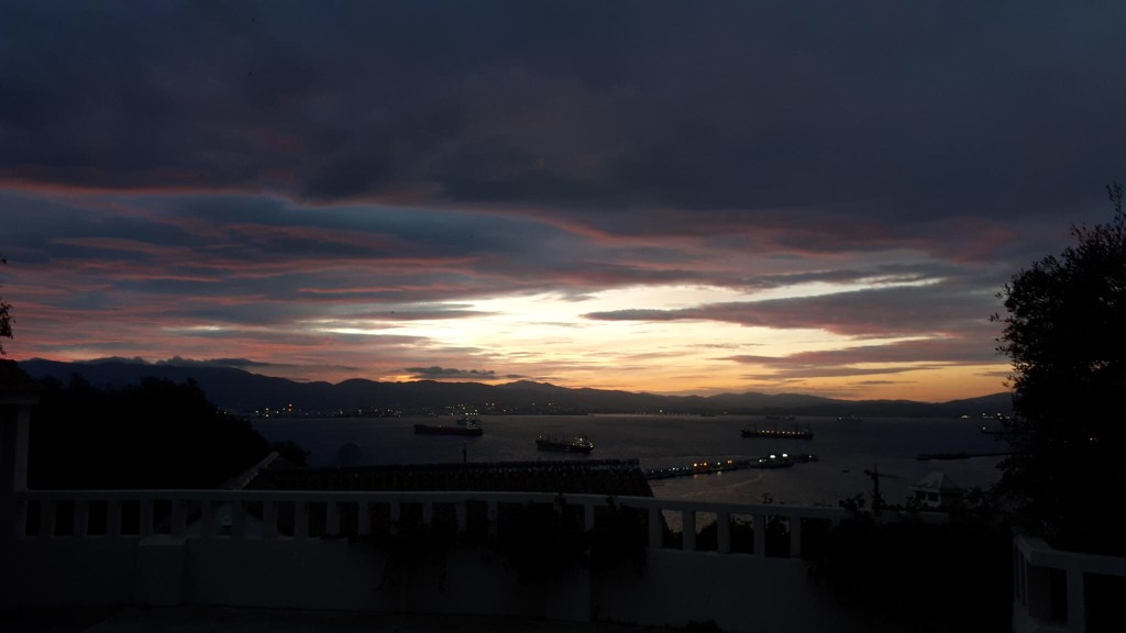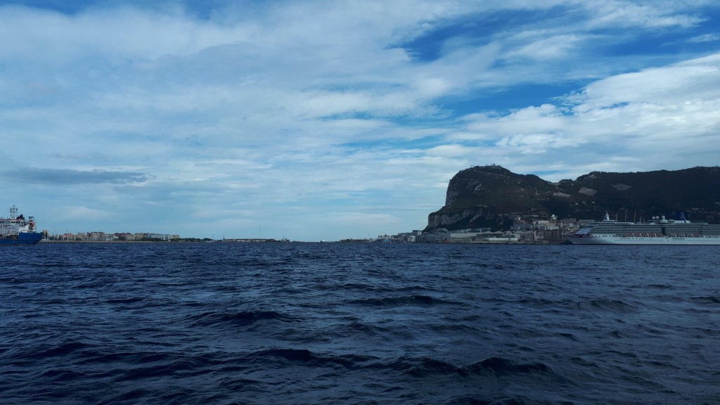 Berückendes Morgenrot am Donnerstag (03.11.), früher Start (09:30), voller Tag unter Gennaker, »farbkastenblauer Himmel« (Ce) in allen Schattierungen und gut Fahrt gemacht. „The Rock“, der Affenfelsen, schiebt sich steil aufsteigend und brüsk abbrechend hinter der nächsten Landzunge in den Horizont: Gibraltar. Die Queensway Quay Marina (im britischen Bereich) hat keinen Platz für ein Schiff wie unseres, liegt anscheinend schon im Mittelmeer.
