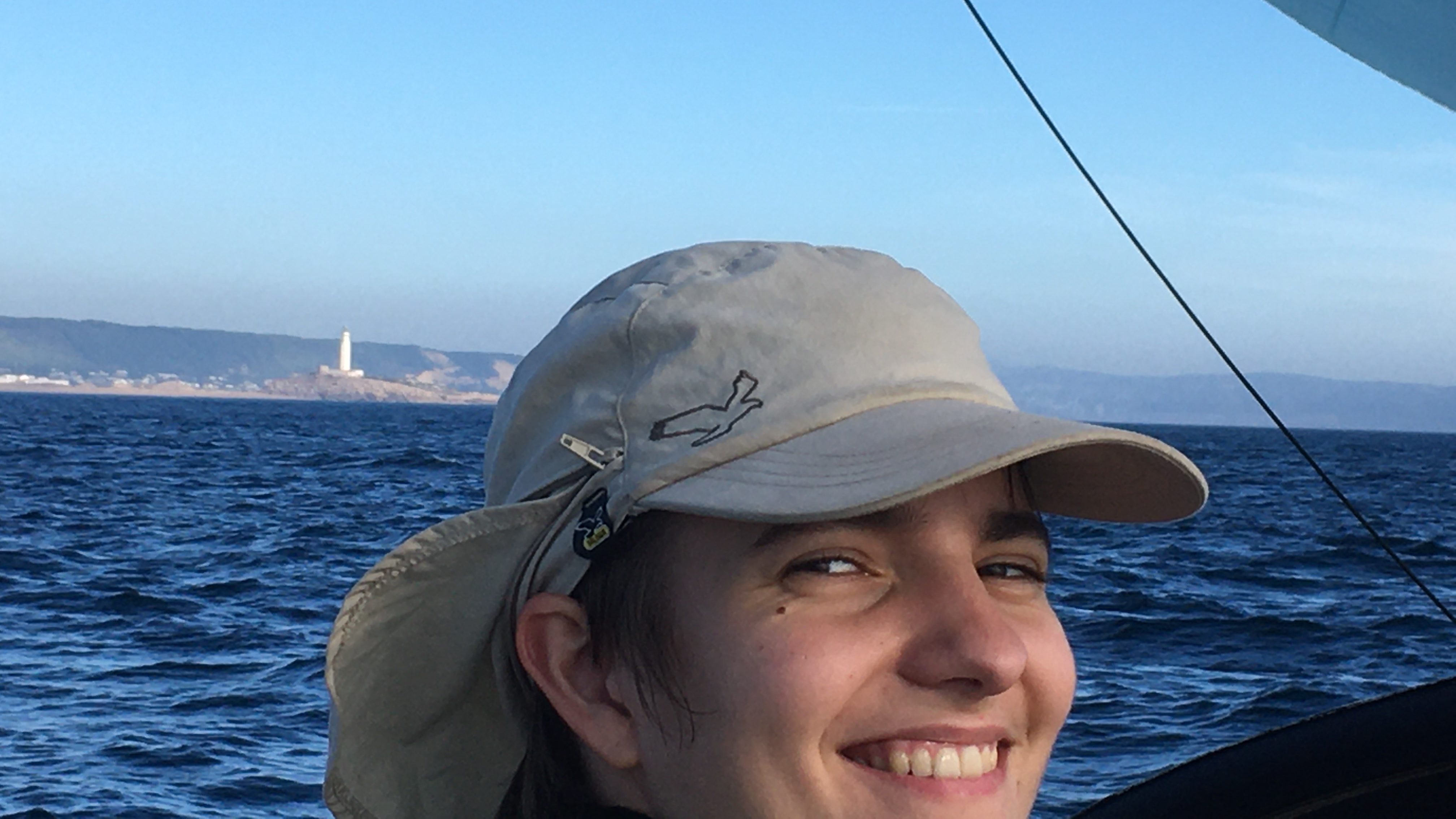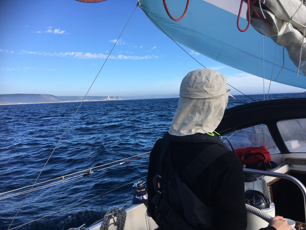Am nächsten Tag Sicherheitseinweisung für Ce und Aufbruch. Sicher einer der schönsten Tage bisher: kräftiger raumer [schräg von hinten] Wind, der Gennaker zog den ganzen Tag, strahlender Sonnenschein. Das Kap von Trafalgar (wo Nelson pures Glück (und günstigen Wind) hatte, wie uns ein missgünstiger Ire angesäuselt-wortreich im Irish pub an der Plaza San Franzisco erklärt hatte) gerundet.
