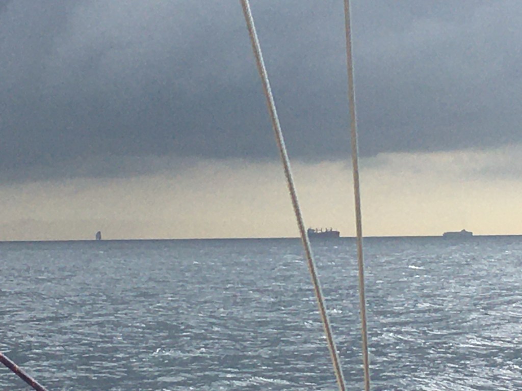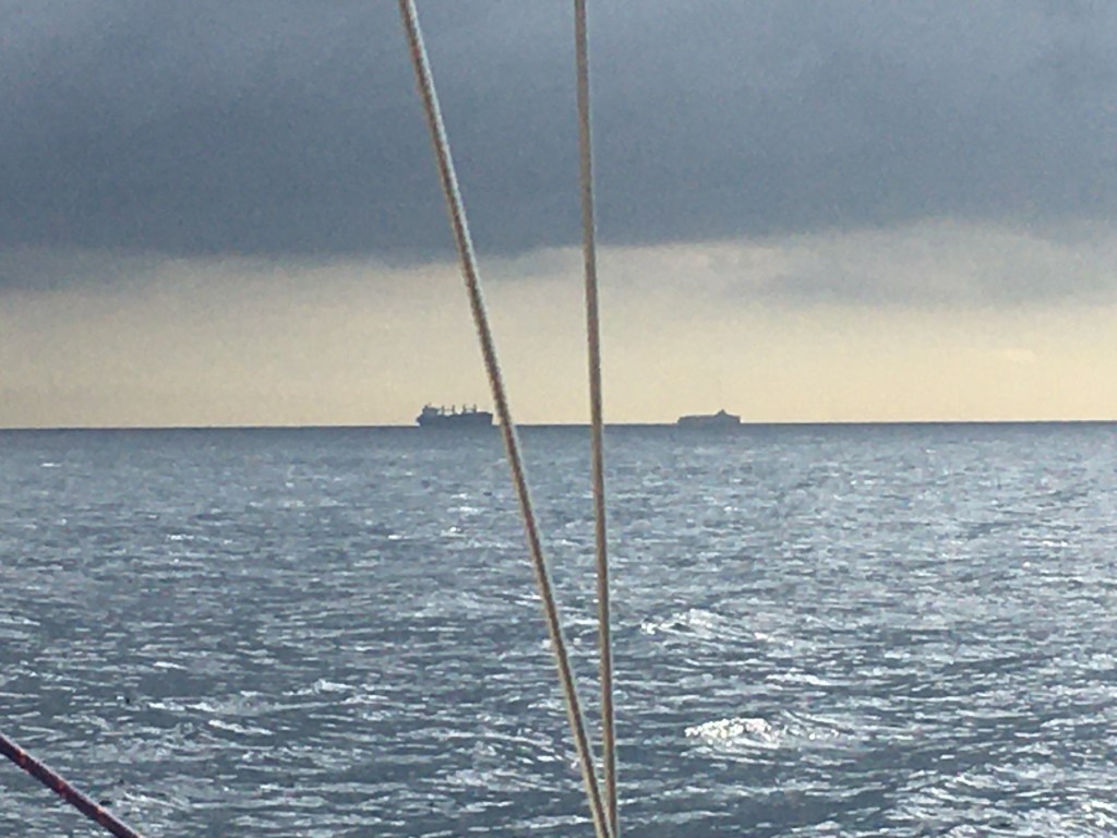 Am Freitag (04.11.) Rauschefahrt unter großer Genua, teilweise im Schmetterling, teilweise bis über 7 kn (wahrscheinlich incl. Meerengenströmung). Und Delfine, eine ganze Schule, sicher mindestens 15 Stück, begleiten uns sicher eine Stunde lang. Ce, die im Bugkorb mit dem Gesicht nach unten lag, kommt ganz beseelt zurück: die Tiere spielen unter und hinter dem Bug mit der Strömung, schubsen sich gegenseitig weg, reiben sich aneinander …