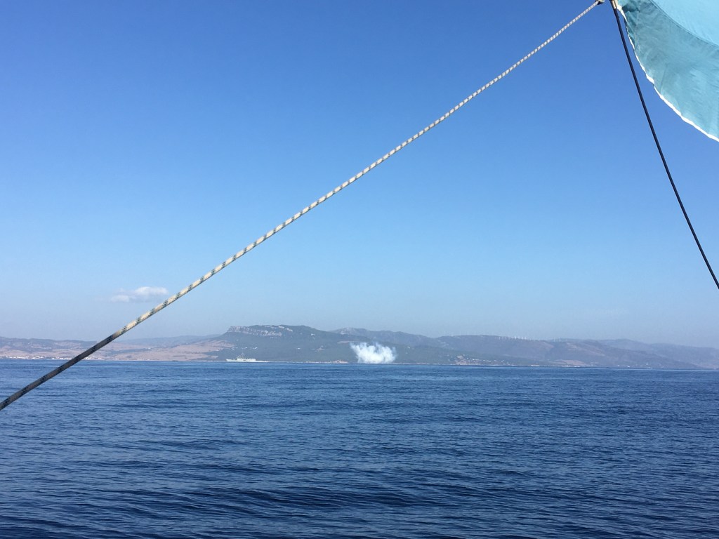 Schon beim ersten Versuch, Barbate zu erreichen waren im Funk irgendwelche Amphibien-Manöver angekündigt, das Gebiet ist Übungsgebiet der spanischen Marine. Als wir am Mittwoch (02.11.) die nächste Landspitze südlich umfahren, liegt oder kreuzt dort ein graues Navy-Schiff. Tasächlich sollen wir das Kap mit drei Meilen Abstand umfahren, weist uns der freundliche Funker (»gracias por su collaboration«) an. Zwei Stunden Umweg straks nach Süden. Und später schießen die tatsächlich blitzend explodierende Salven Richtung Land!