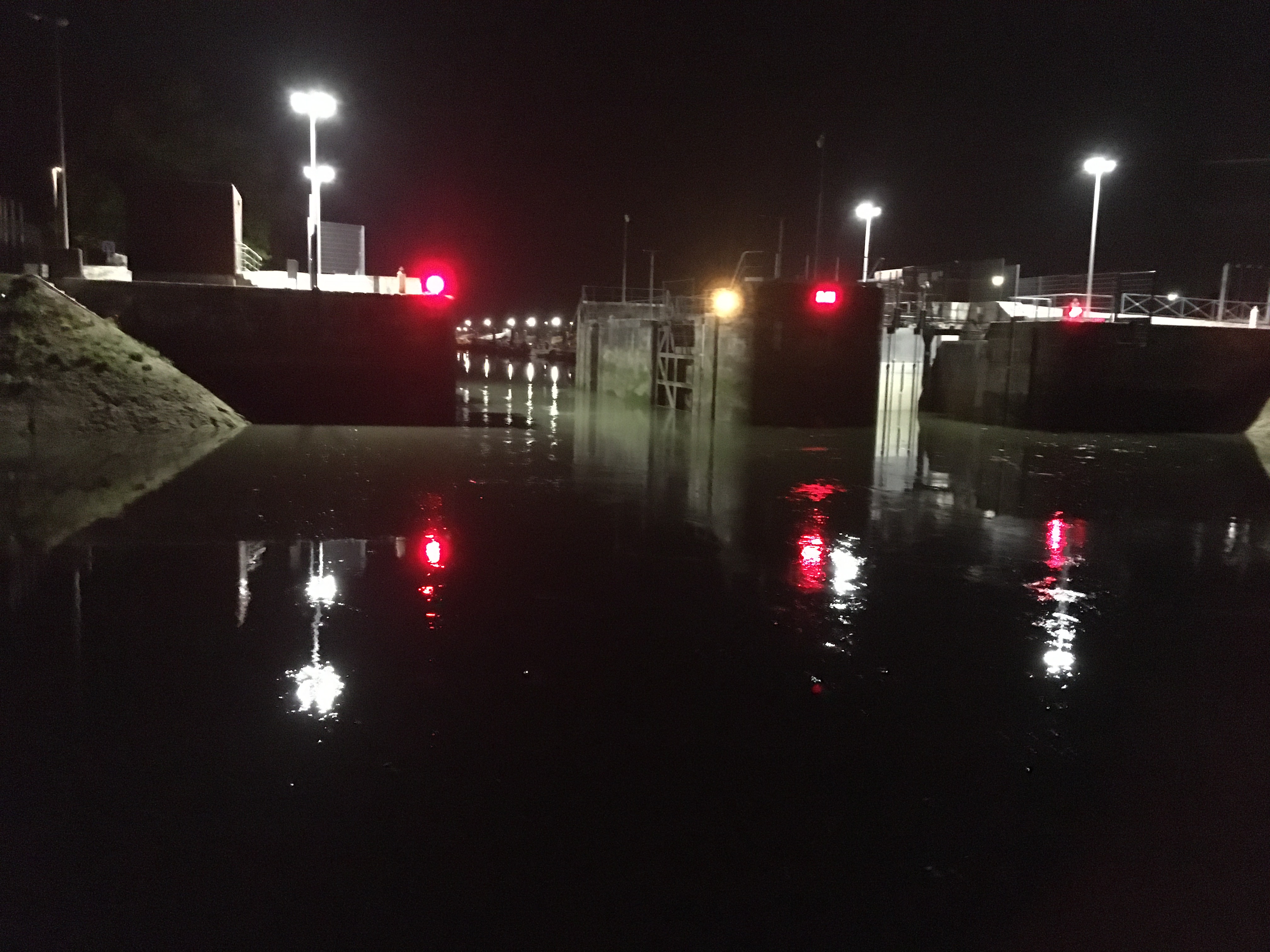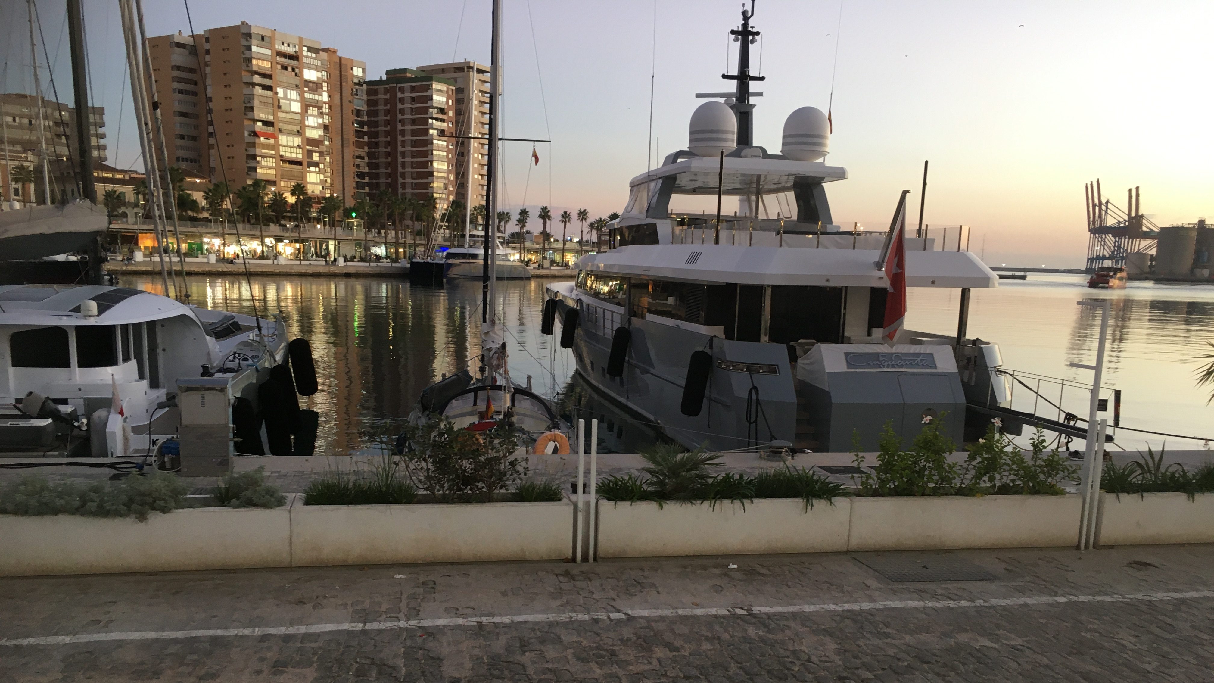 Dienstag (08.11.), 02:17h (!!). In Málaga soll es, sagte mir der Hamburger vom Nachbarboot in La Linea, ein völlig leeres neues Hafenbecken geben, wo man gut (und umsonst) ankern kann. Auf Karte und Navionics finde ich nur einen erweiterten alten Flusslauf, außerhalb und neben dem Industriehafen. Die Marina liegt ebenfalls ab vom Schuss (und hat schlechte Kritiken: teuer, keine Liegeplätze für Durchreisende, unfreundlich). Aber in der Karte ist im innersten Hafenbecken eine Marina verzeichnet, allerdings nur als Symbol, kein Funkkanal, keine weiteren Angaben. Aber wenn da eine Marina ist, kann ich dort auch reinfahren. Als endlich die drei Kreuzfahrtschiffe größer werden, auf die ich drei Stunden zugedampft bin, (kein erwähnenswerter Wind), tuckere ich gegen halb fünf endlich in die Einfahrt (16:30 Uhr wird die Málaga Port Control später als TOA [time of arrival] eintragen: ich hätte mich per Funk (Kanal 11) anmelden müssen, das war aber weder in der Karte noch auf Navionics vermerkt). Das innerste Hafenbecken (noch ein viertes Kreuzfahrtschiff) ist zwar leer, aber superschick und die Yachten am Kai sind alle riesig. Vorsichtig frage ich über VHF, ob sie auch eine kleine Yacht wie die Elli nähmen? – Klar, ich soll irgendwo festmachen, er (der Marinero) werde dann gleich vorbeikommen und mich einweisen. Gut. Kommt er auch und gibt mir einen Platz zwischen zwei Megayachten. Rückwärts Einparken, der Besitzer (vermute ich) des spiegelblanken hellgrauen Luxuskatamarans neben mir wirkt sehr nervös, packt zusätzliche (unbenutzt aussehende) Fender an die Seite zwischen uns, springt schließlich auf die Kaimauer und hilft dem Marinero, mich festzuzurren. Denn: der Hafen ist auf Yachten ab 30m eingestellt, die Muringleinen ziehen uns gegen das Nachbarschiff. Erst eine zusätzliche Spring vom Bug zu einem seitlichen Poller (es gibt keine Klampen) hilft.