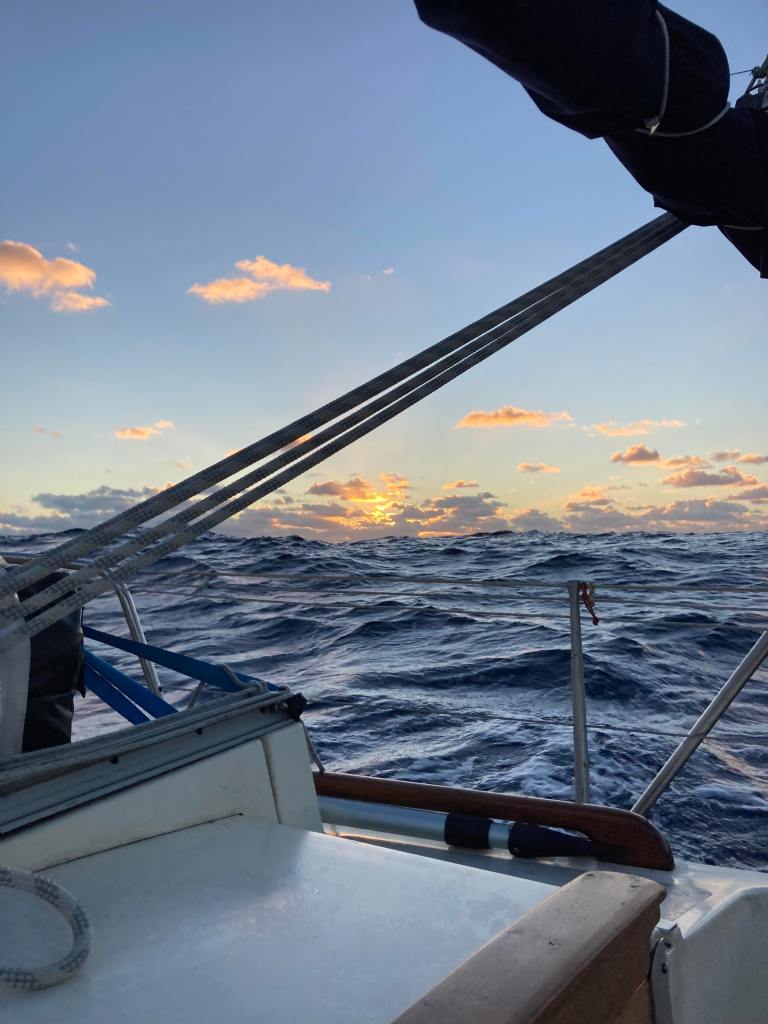Am Freitag (20.01.) zeigen sich einzelne hohe Wolken mit dunkler Unterseite am ansonsten bayrisch-blauen Himmel. Sollten das die berühmten „Squalls“ sein [übergangslos einbrechende Lokalgewitter mit heftigen Böen und Starkregen]? Zum Glück sind wir mit zwei Reffs im Groß und dem kleinen (rotbraunen „Sturm“-) Vorsegel losgefahren. Und zum Glück ziehen die dunklen Wolken seitlich vorbei. Jetzt können wir die beiden Reffs aus dem Großsegel schütteln: volle Fahrt voraus, nach Südsüdwest. Nächtlicher Eintrag ins Logbuch: „Wasser dringt ein, im Vorschiff, Backbordkoje (weist auf) Hüfthöhe Tropfspuren (auf, auch auf Gawains Yogamatte)“. Die Matratze darunter ist völlig durchnässt (und kommt in die Achterkajüte, die unbenutzt ist, weil wir beide im Salon schlafen). (Entwarnung: Es ging um maximal zwei Tassen, wahrscheinlich durch eine nicht richtig geschlossene Vorschiffsluke; oder Kondenswasser). Samstag (21.01.) weiß das Logbuch: „nachts wie auf Schienen, bis 6 kn.“ Ein Traum also. Am Nachmittag desselben Tages: „wild“. 23:45h: „[Wind] surrt in der Takelage, Welle steigt ein“. Waren aber nur ein paar Liter, nicht mal knöchelhoch, nur im Cockpit. Aber seitdem lassen wir das untere Stellbrett im Niedergang stehen [das Wassereinbruch in den Salon verhindert soll]. Geschwindigkeiten immer wieder über sechs Knoten, einmal sogar über 8 – Fahrradfahrergeschwindigkeit, fühlt sich aber sportlicher an, könnt ihr mir glauben. Die gute ELISA schmirgelt sich durchs Meer, tatsächlich ähnelt das Geräusch des Wassers am Rumpf nicht mehr dem üblichen Rauschen und Gurgeln, sondern eher einem feinen Schleifen. Hält auch das Unterwasserschiff sauber, stell ich mir vor. Etmal 99 Meilen (ca. 170 km). Wir fahren ohne Vorsegel (das hat im Windschatten des inzwischen ungerefften Groß´ nur gerattert und geknallt) ziemlich platt vor dem Wind. Und hurtig: „(Wind) pfeift“, „Vorwind, wild bewegt“. Etmal am So, 22.01.: 141 nm, (ca. 250 km) – Rekord!