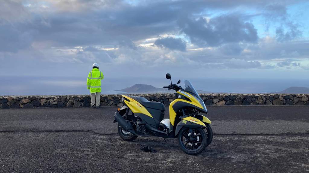 Anschließend Mittagessen im Asador (mies), merienda in einem Ausflugslokal voller angeheiterter Festgäste, Karaoke zu Gitarrenbegleitung und das ganze Lokal singt mit (phantastisch). Im Abendlicht nach Norden hinauf zum Mirador del Rio (Rio heißt die Meerenge zwischen Lanzarote und La Gracía, der Nachbarinsel). Aussicht atemberaubend, aber der Mirador hatte geschlossen, war nix mit dem heißersehnten Kaffee auf der Aussichtsterrasse. Kühl war es nämlich schon auf dem Roller, selbst hinten, obwohl Gawain fuhr wie ein Pro und uns auch navigierte.