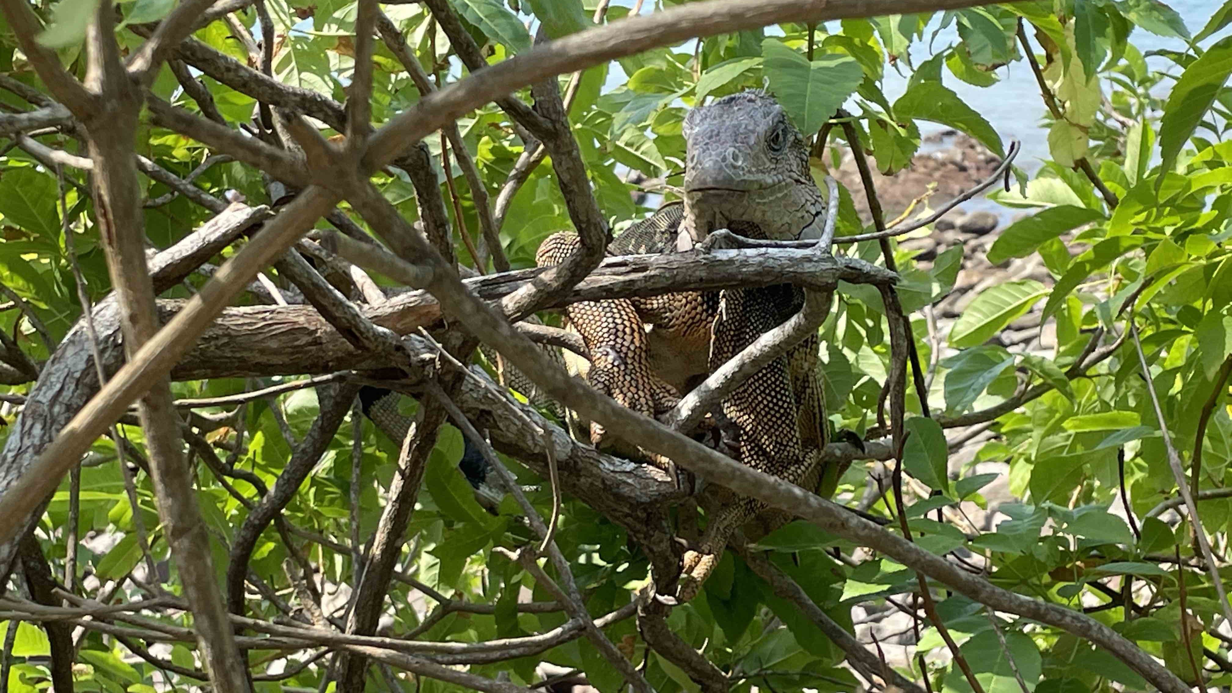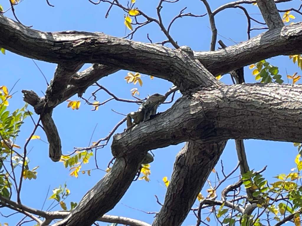 10:30 Smithsonian Institute: Iguanas, Fische, Schwämme, Schlafbären, Schmetterlinge (in den ehemaligen Bunkern von Punta Culébra, einer der Verteidigungsanlagen, die von den Amerikanern auf jeder der Inseln gebaut worden sind). Ganz schön. Voller Kindergartenkinder. Iguanas schnalzen oder züngeln die Süßigkeiten weg, die den Kindern heruntergefallen sind, von unter den Bänken der Picknickecke. In einem selbsttragenden (Buckminster-Fuller-) Dome ein Schmetterlingsparadies. Der Aus-/Eingang ist doppelt gesichert: außen Gazetür mit Riegel, innen: Plastikstreifen wie in einem Kühlhaus. Und in der Schleuse dazwischen: ein Ganzkörperspiegel, damit man Mariposas ausmachen könnte, die sich auf die Kleidung gesetzt haben. Hinter den Kindergartenkindern scheucht innen eine Wächterin die Schmetterlinge weg vom Eingang: »la guardiana de los Mariposas«. Da grinst und nickt sie.