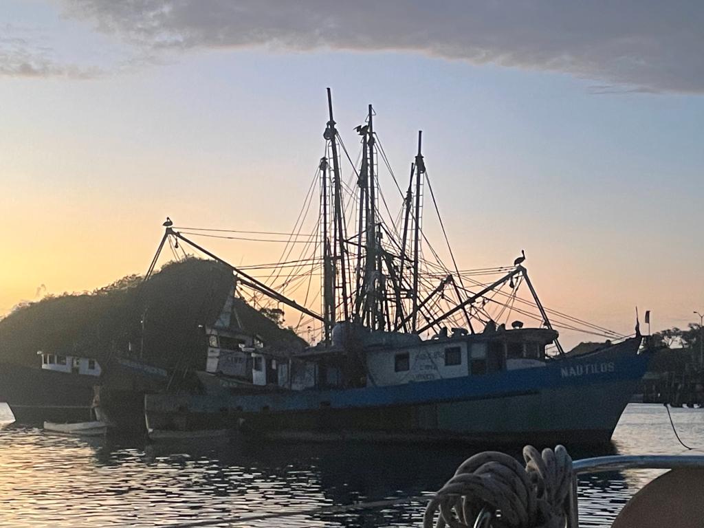 Samstag früh schleppt mich Niño ein paar Dutzend Meter zurück, weil ich nach vorne nicht rauskomme, da liegt die Ankerleine seines Kahns quer. Dann geht es mit einem Windhauch (zum Glück in die richtige Richtung) im Schritttempo aus dem Hafen. Abschiedswinken von benachbarten Kähnen und einer Offiziellen am Kaiabschluss: 08:00 ab Vacamonte. Niño fährt noch ein paar hundert Meter mit, umkreist das Boot, macht Videos und Fotos ohne Ende. (Am Vorabend hatte er sich als Schiffsbesitzer inszeniert, mit Kaffeetasse am Steuerrad, winkend. Sehr lustig. Er ist inzwischen zu so etwas wie dem Grundversorger des Hafens aufgestiegen, verkauft Kippen, Kekse, Softdrinks. Und verdealt Fisch, den er manchmal als Bezahlung bekommt. Den Freitagvormittag lang haben er und ein Kumpel meterlange dorschähnliche Fische auf dem Boden seines Kahns zerlegt, Haut abgezogen, filettiert. Sah professionell aus.)