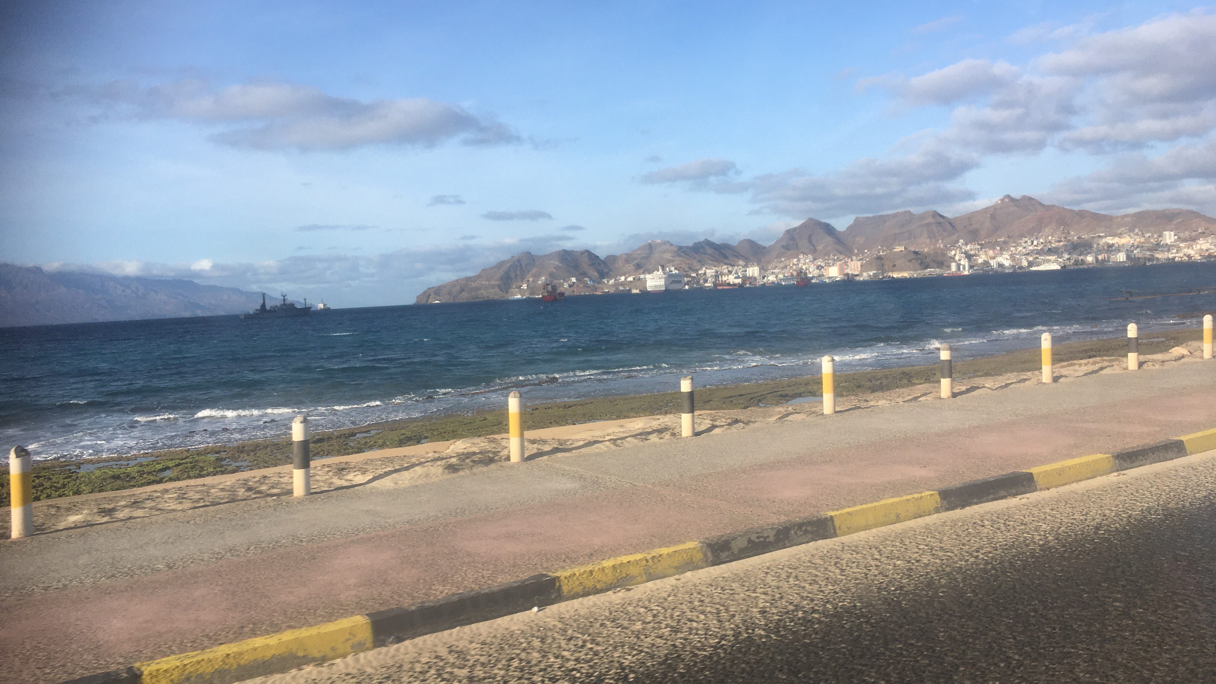 Die Strandpromenade fängt belebt als Treffpunkt der Jugend an, ein Grilllokal mit Biergarten im baumbestandenen Park am Wasser. Von da ab zieht sich die Spazierstrecke das Ufer entlang. Auf dem Rückweg wage ich mich durchs Hafenviertel – alles völlig harmlos. In einer In-Bar, halb offen am Ufer, mit Livemusik (zwei Jungs, Gitarre, Cajon) ist die Hölle los. Ich muss vor allem die Toilette aufsuchen, kann mich aber nicht verständlich machen, die gebe es hier nicht. Finde ich aber. Nach zwei Halbliterflaschen Spatenbräu sieht alles noch freundlicher aus. Auf dem Rückweg setzt Regen ein, ich stelle mich unter. Und bin um elf wieder aufm Schiff.